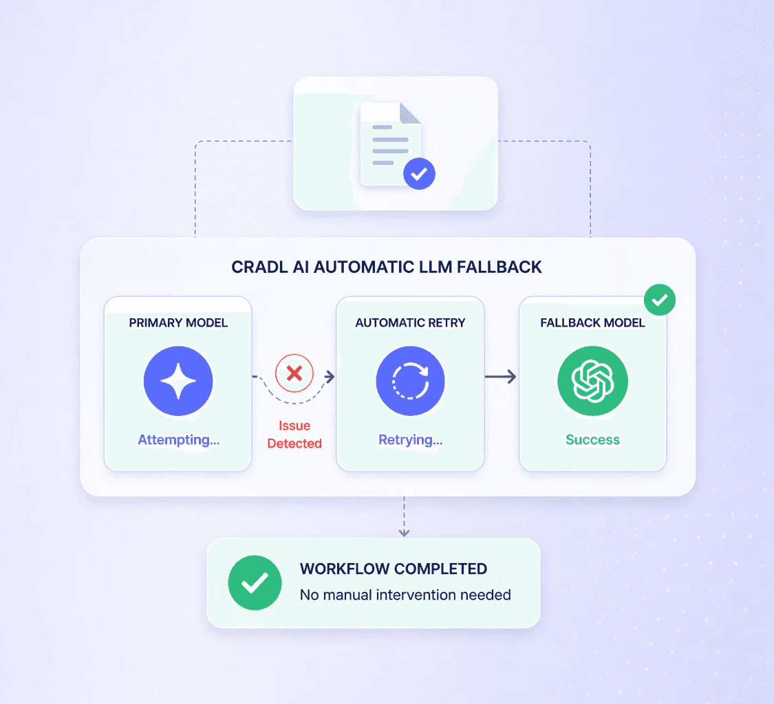 LLMs are in high demand, and latency or availability issues are a reality. To keep your agents running without interruption, we have introduced automatic fallback support for LLM models. If your primary model encounters an issue, Cradl AI will now seamlessly retry and, where needed, route to a fallback model — all without any manual intervention. This means fewer failed runs, less downtime, and greater confidence that your workflows will complete reliably, even during peak demand periods.